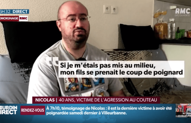 « J’ai vu un individu saisir une femme par ses vêtements ou par le col et la poignarder. Donc j’ai pris les enfants et on a commencé à reculer. Mais l’agresseur nous a rattrapé dans les escaliers. Il a commencé à me poignarder. Je me rappelle avoir mis les deux mains sur les rambardes et lui avoir dit ‘non, tu ne passeras pas, j’ai mes enfants derrière tu ne passeras pas’. Je lui ai mis plusieurs coups et ça ne lui a rien fait. C’était impossible qu’il soit dans un état normal. Si je ne m’étais pas mis au milieu c’est mon fils qui prenait le coup de poignard. Donc je suis content de l’avoir pris à la place de mon fils. J’ai une bonne entaille de deux ou trois centimètres de long sur quatre de profondeur. J’ai eu du bol parce qu’il n’a touché aucun organe et il n’a pas sectionné de nerf. », raconte Nicolas.