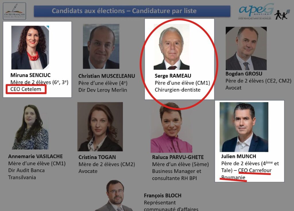 Pourtant, Bompard ignorait encore le pire : son propre employé, le tout nouveau CEO (PDG) de Carrefour en Roumanie – Julien Munch, un Français – fait liste commune dans les élections du comité de gestion du Lycée Français (8 millions d’euros de budget) avec… Serge Rameau, un candidat aux élections consulaires soutenu par EELV, LFI, et toutes les forces d’extrême gauche !