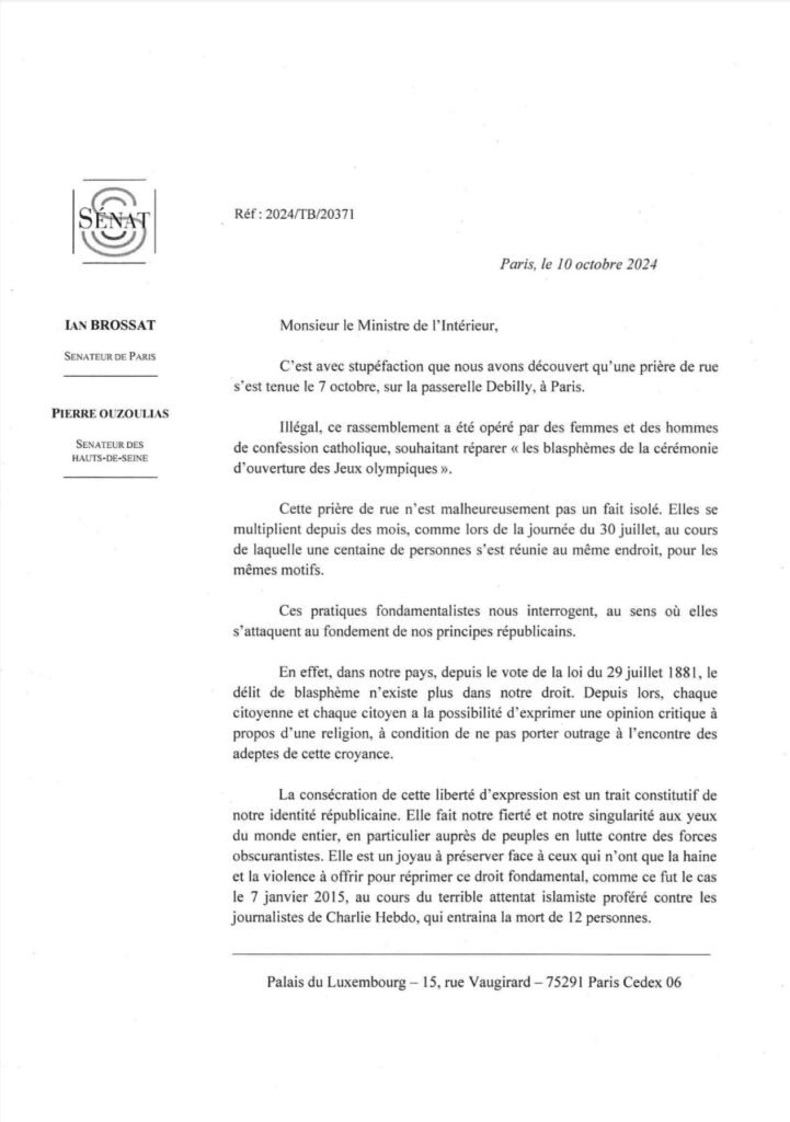 Mais il y a pire. Dans la missive qu’il envoie au ministre de l’intérieur, il compare allègrement ces catholiques-ci avec les frères Kouachi, qui massacrèrent la rédaction de Charlie Hebdo.
