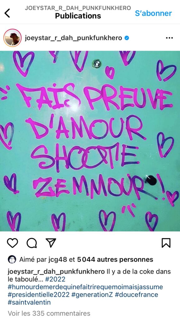 Ils sont devenus fous. Le rappeur Didier Morville, « connu » sous le « nom » de JoeyStarr, a publié sur son compte Instagram une image incitant au meurtre du candidat de Reconquête! à l’élection présidentielle.