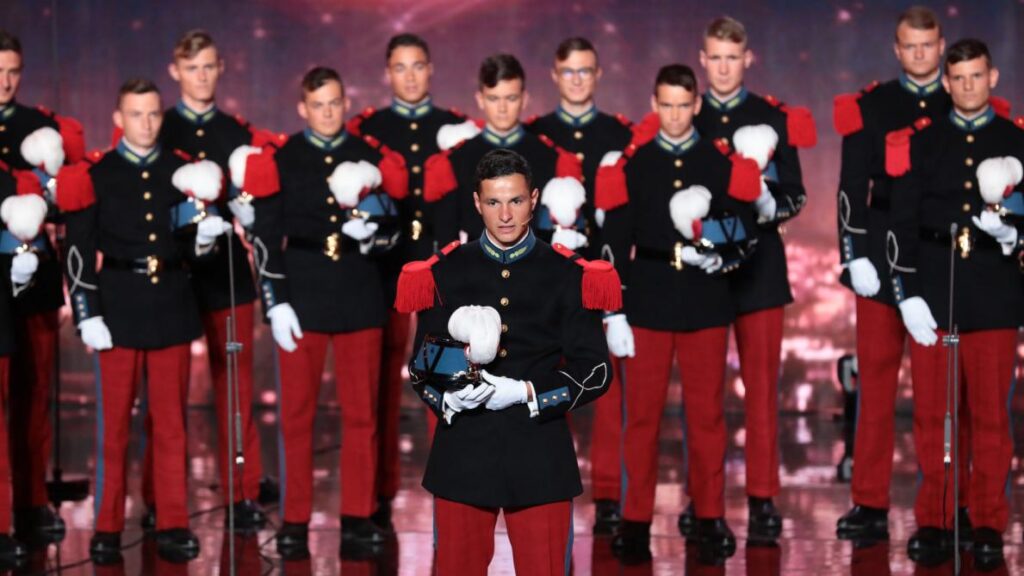 Les élèves officiers chanteurs de l’Académie militaire de Saint-Cyr Coëtquidan ont été envoyés directement en finale grâce au golden buzzer de Karine Le Marchand, animatrice de l’émission de M6, La France a un incroyable Talent. Elle a appuyé alors que les membres du jury – Marianne James, Hélène Ségara, Sugar Sammy et Éric Antoine – ont donné un oui pour l’accession à la prochaine étape. Karine Le Marchand a expliqué :