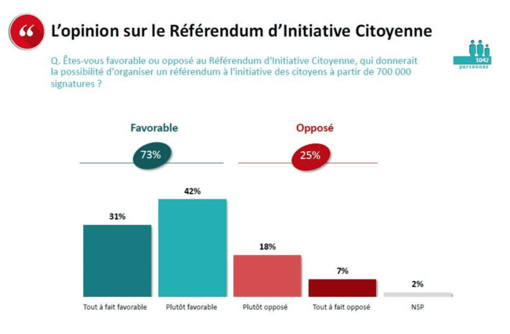 A la question « Etes-vous favorable ou opposé au référendum d’initiative citoyenne, qui donnerait la possibilité d’organiser un référendum à l’initiative des citoyens à partir de 700.000 signatures ? », 73% ont répondu par l’affirmative (31% tout à fait favorable et 42% plutôt favorable), et 25% par la négative (18% plutôt opposé, 7% tout à fait opposé, et 2% NSP).